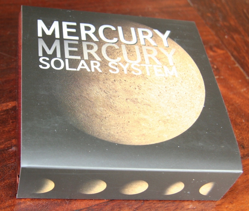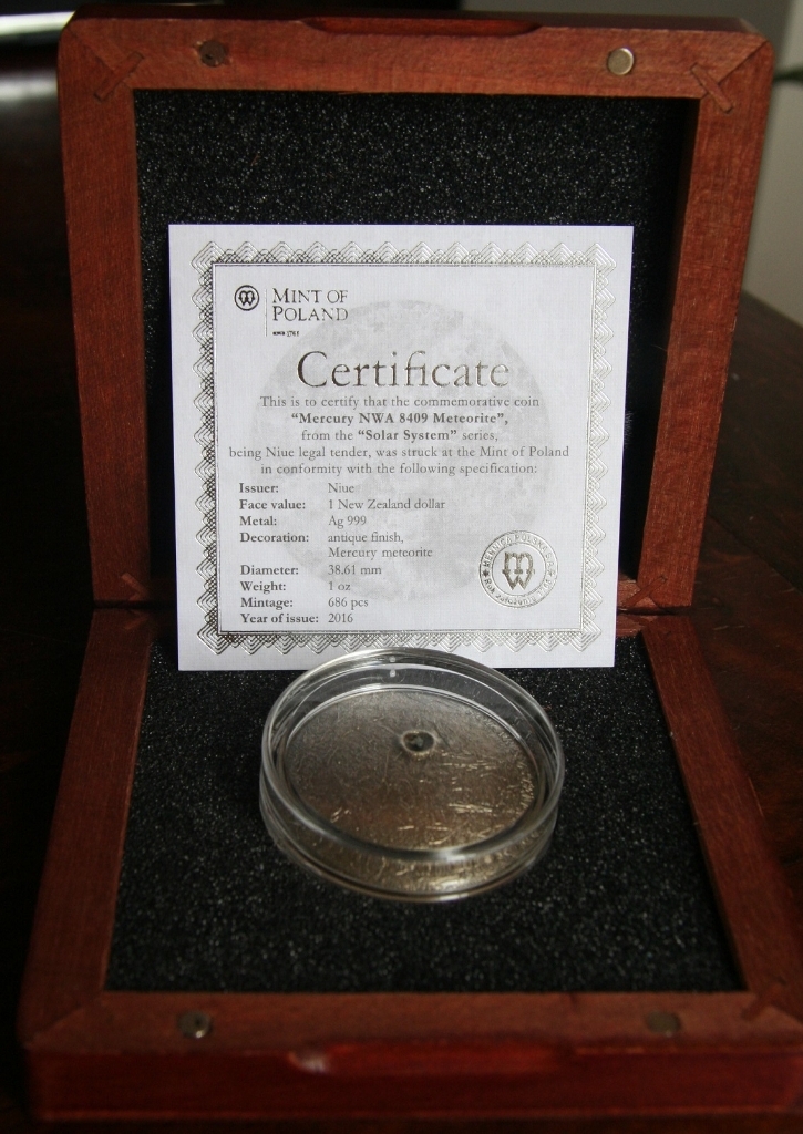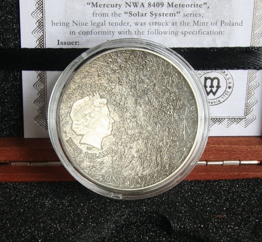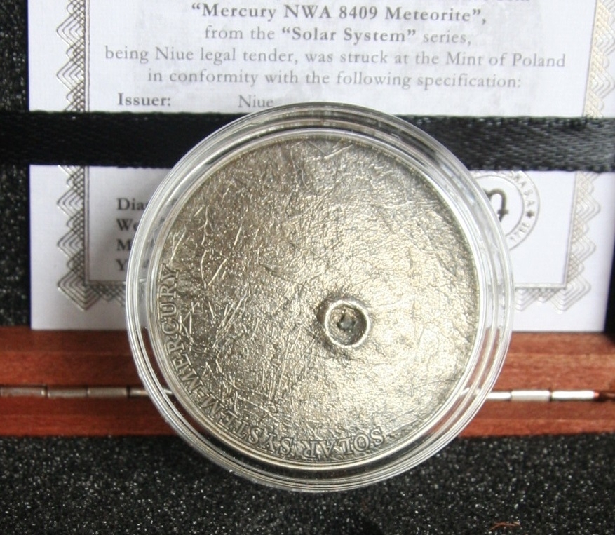 Merkury to druga moneta z serii. Znajdziemy na niej prawdziwy kawałek meteorytu z Merkurego NWA 7325/8409. Inne monety z serii to: Księżyc 2015, Merkury 2016r. , Mars 2017r. , Ziemia 2018r.